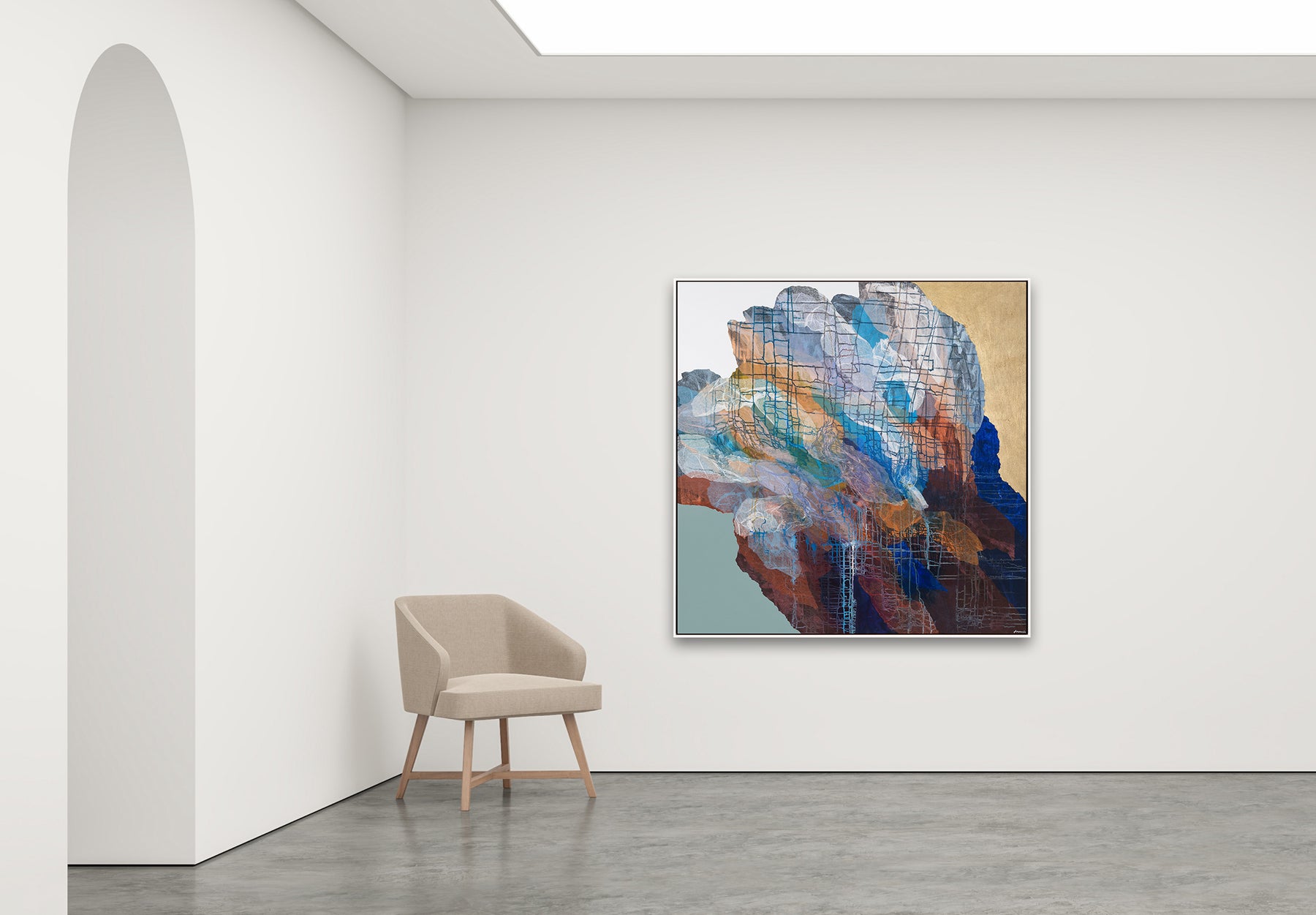 Button Grass portrays a sweeping floral abstraction that feels both grounded and ethereal. Layers of terracotta, cobalt, ochre, and turquoise fold and cascade like leaves or petals, their surfaces woven through with fine grid-like lines that suggest structure and rhythm.