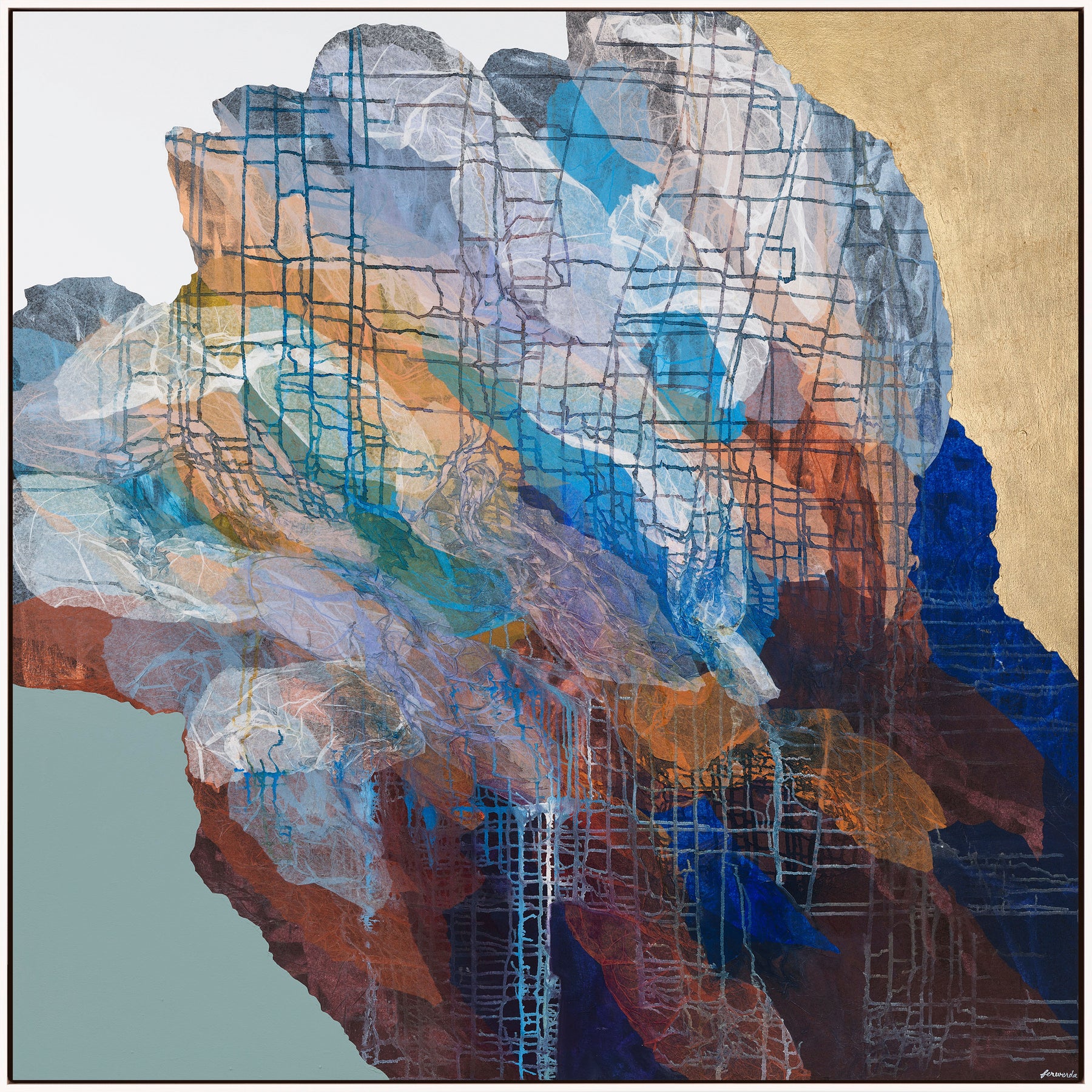 Synthetic polymer paint, ink and collage with gold metallic leaf and UV gloss varnish on canvas