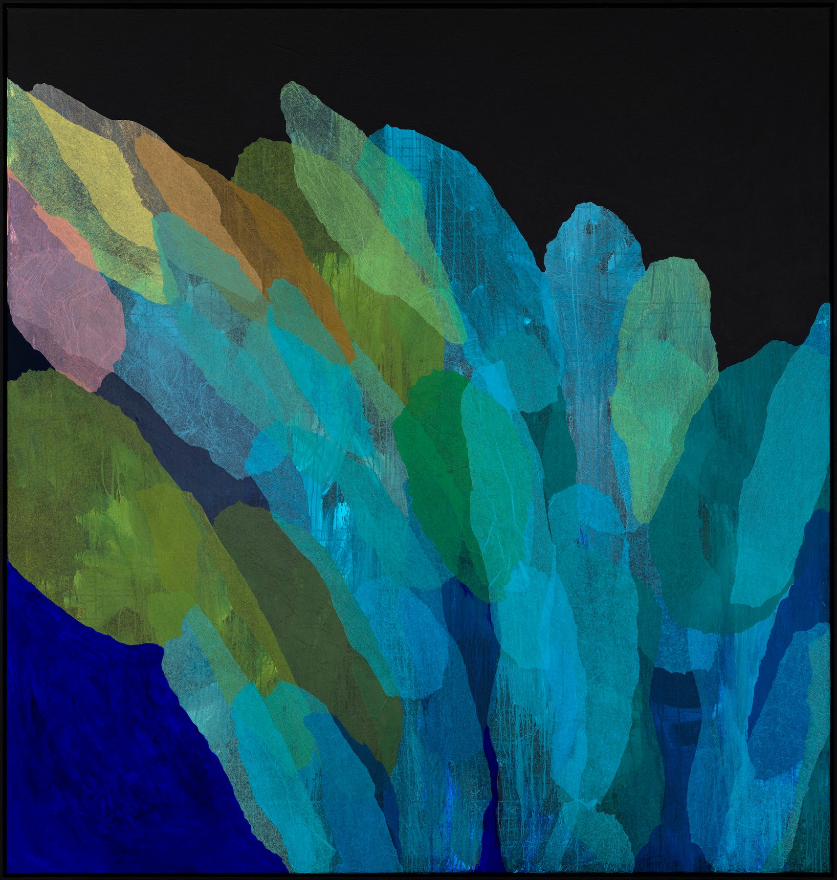 The luminous shapes appear to glow against a deep black background, while cobalt at the base anchors the composition. Fluid textures suggest organic growth, yet the flattened planes retain a graphic clarity that heightens contrast. The work balances painterly gesture with reductive abstraction, evoking quiet reverence for nature’s enduring beauty.