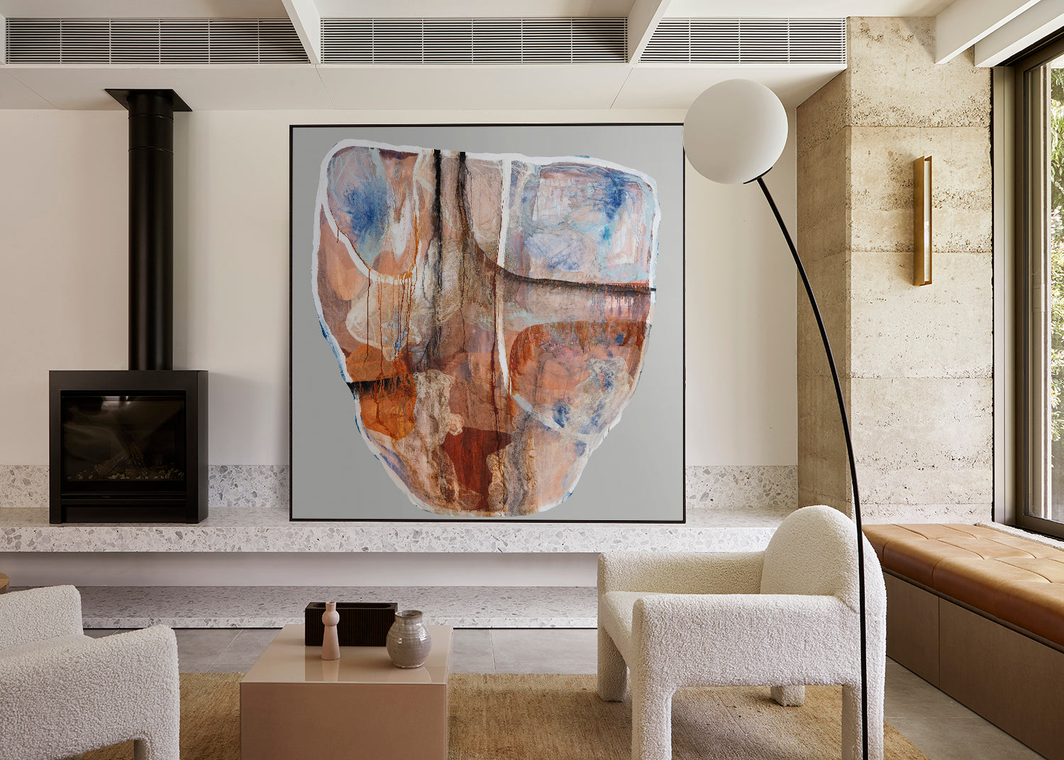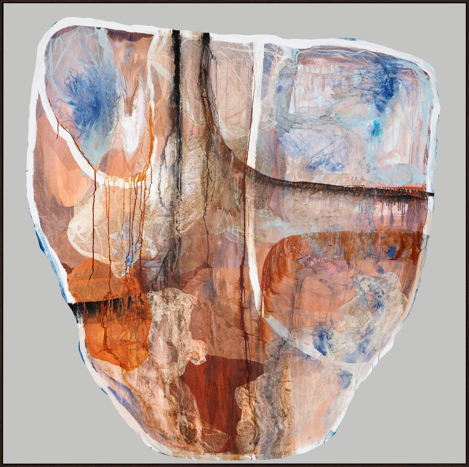 Iron Vessel presents a monumental vessel form, its surface alive with earthy ochres, rust tones, and washes of blue. Veins of dripping paint run vertically, suggesting age, gravity, and the passage of time.