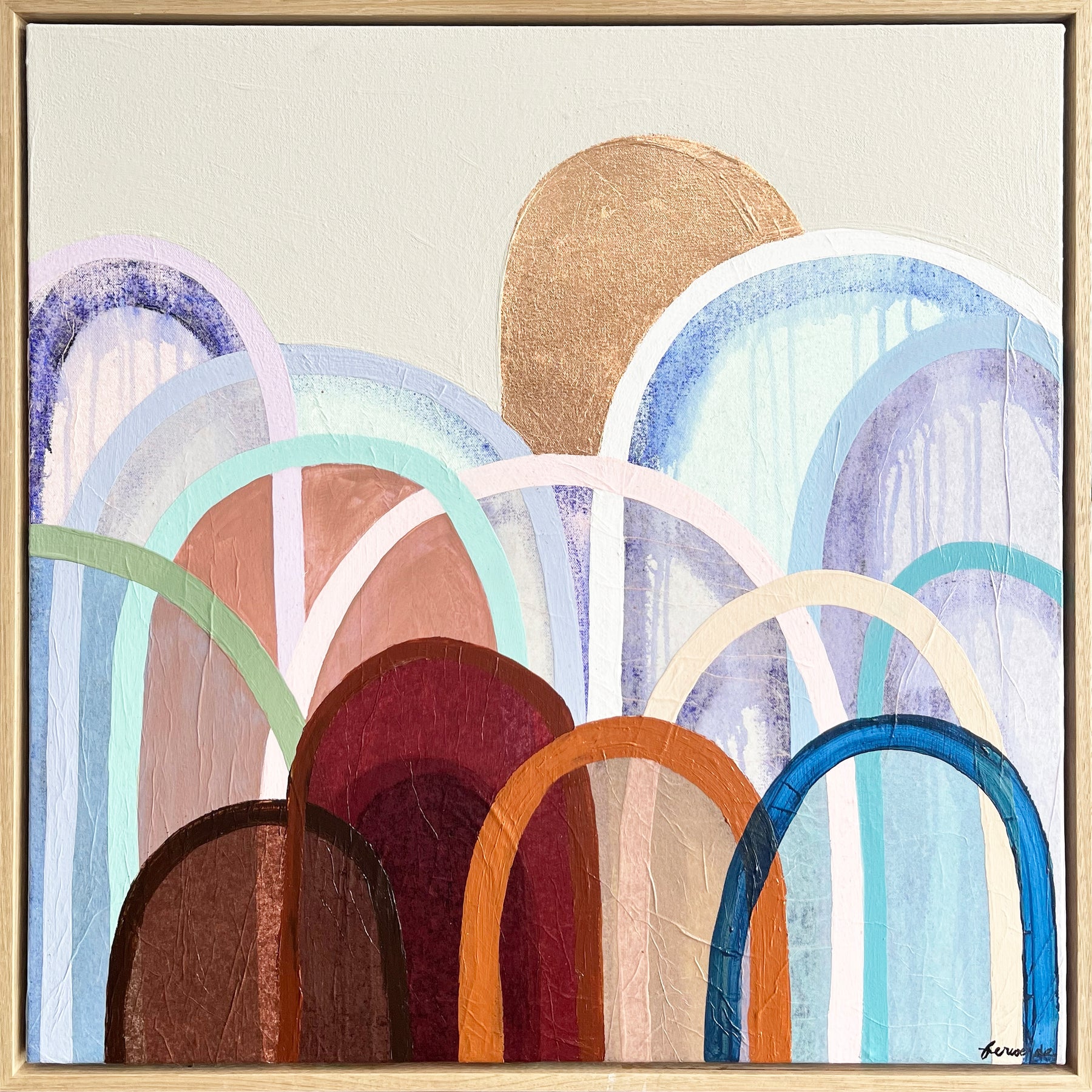 Synthetic polymer paint, collage and rose gold metallic leaf with UV gloss varnish on canvas