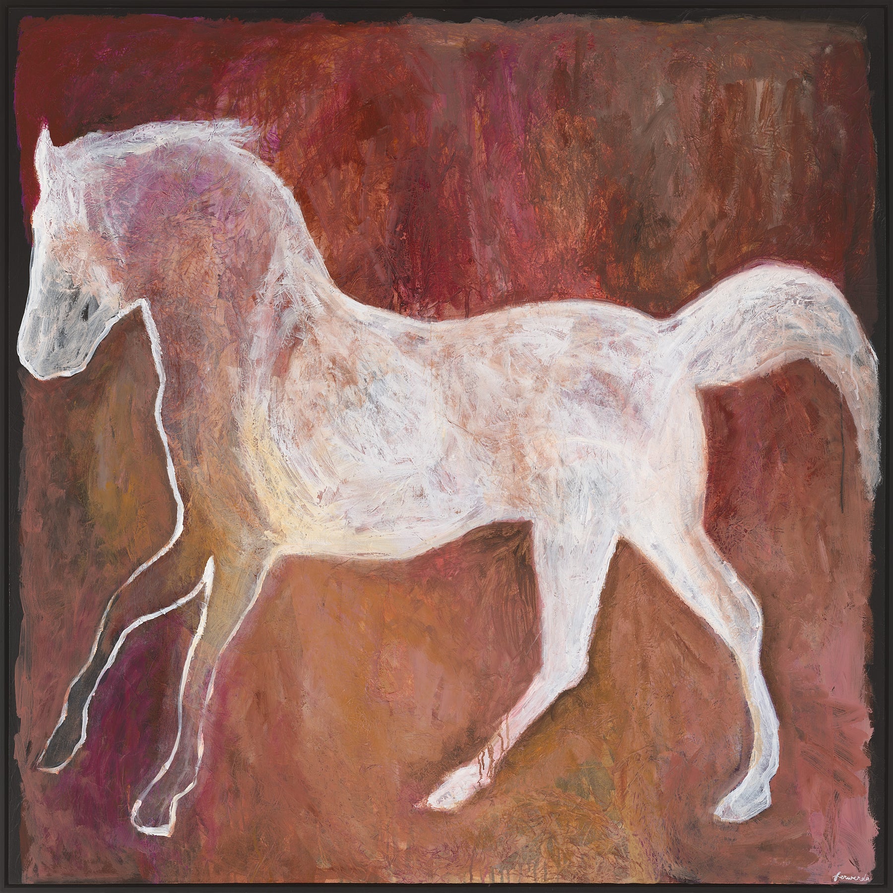 In Succession March, a white horse stands boldly against a richly textured background of burnt umbers, deep reds, and earthy browns. Its body is rendered with layered strokes of white and pale tones, allowing hints of pinks, ochres, and greys to shine through, giving the animal a luminous, almost ethereal quality.