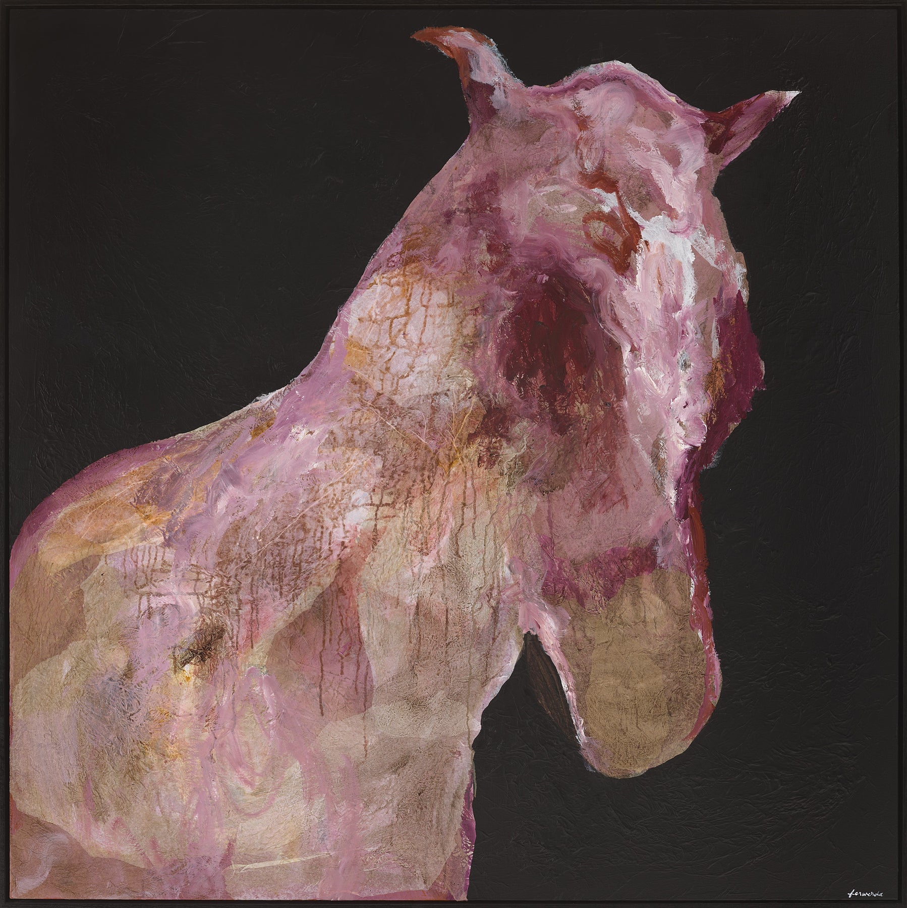 The animal’s head tilts downward in a moment of quiet poise, its ears pricked and mane abstracted into washes of colour. Against the stark black background, the horse appears luminous and monumental, its textured body radiating both strength and vulnerability. The interplay of rich pinks and earthy hues imbues the figure with a totemic quality, embodying beauty, power, and spiritual presence.