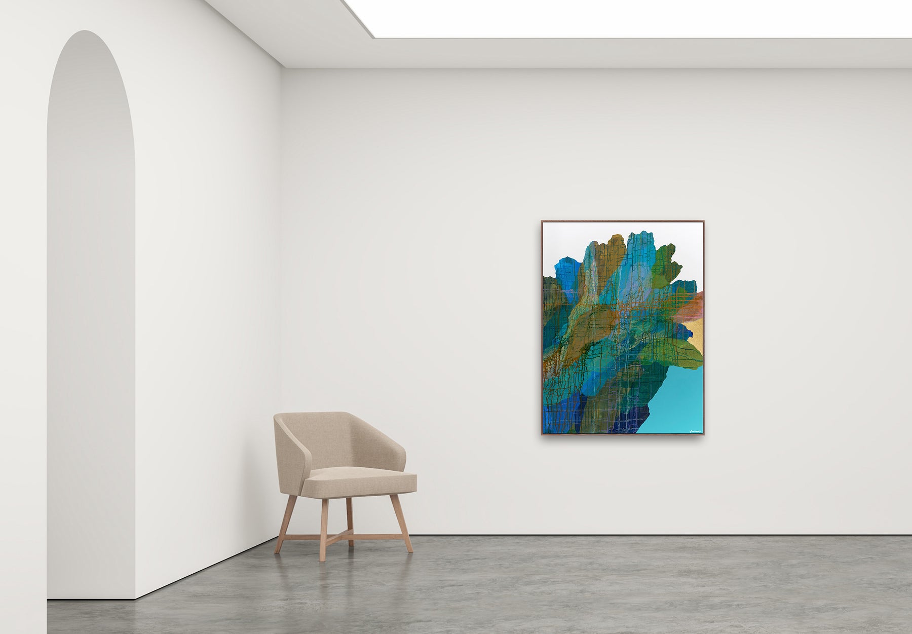 Windmill Grass II presents an abstracted floral form rising boldly against a pale turquoise, white and metallic gold ground. Broad shapes in layered blues, greens, and ambers overlap like petals or leaves, their surfaces intersected by fine, grid-like lines in warm copper tones that cascade across the composition.