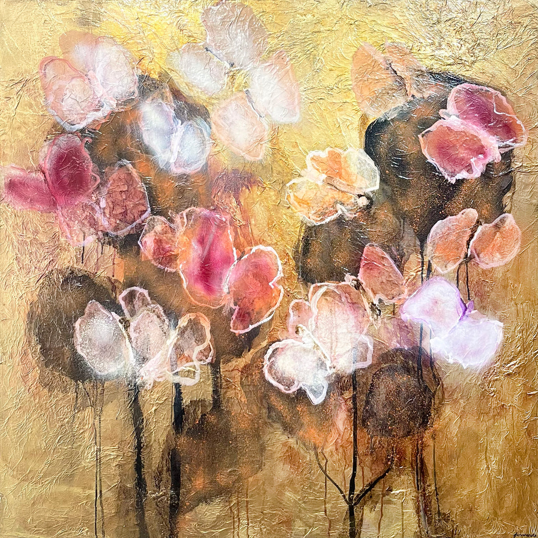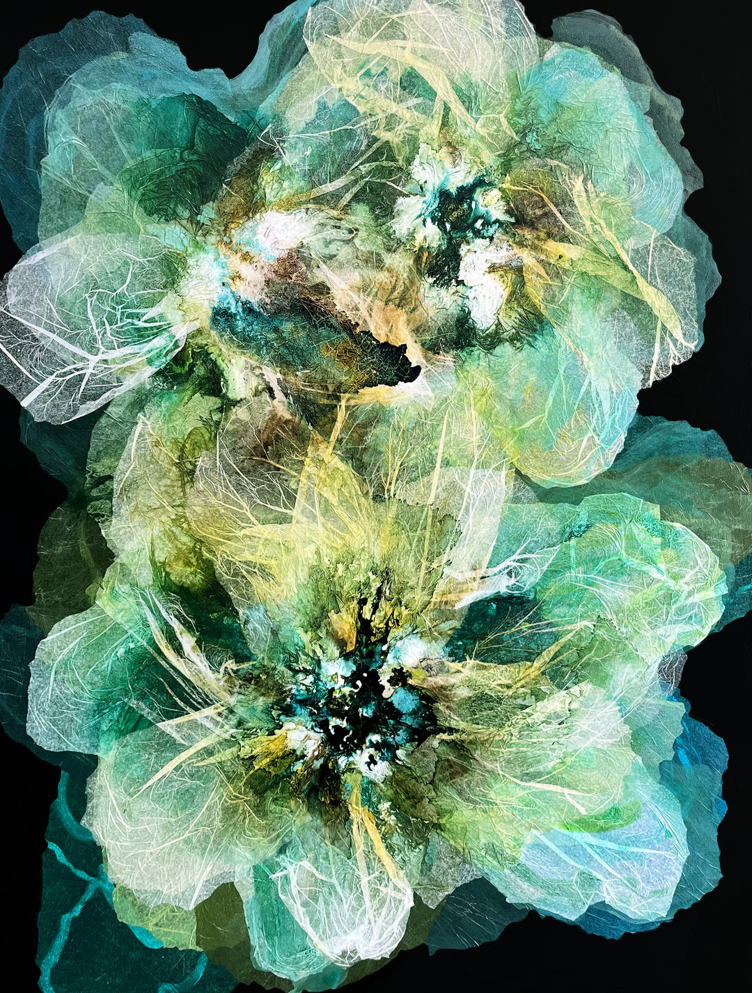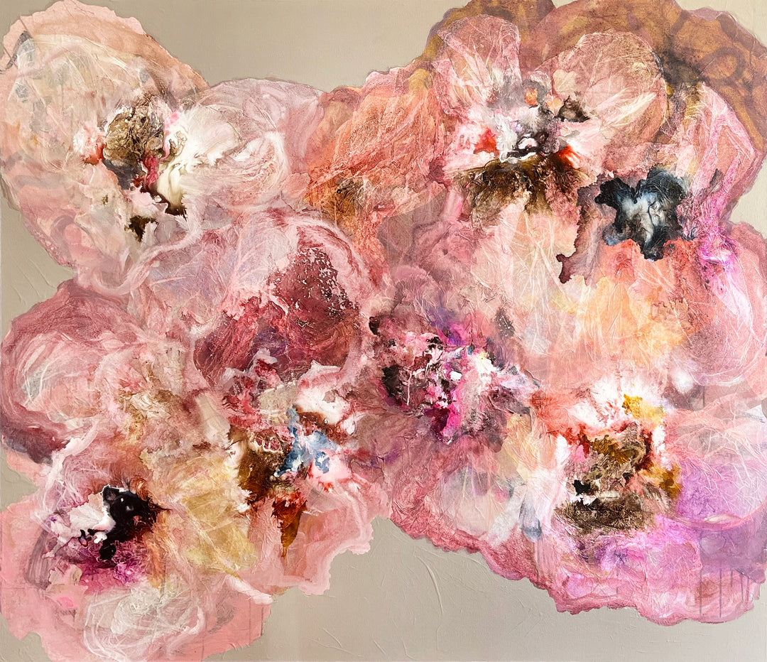 So, my Champagne Poppy paintings attempt to emulate the dancing of these petals and the living form, so the blooms seem to explode from the canvas.