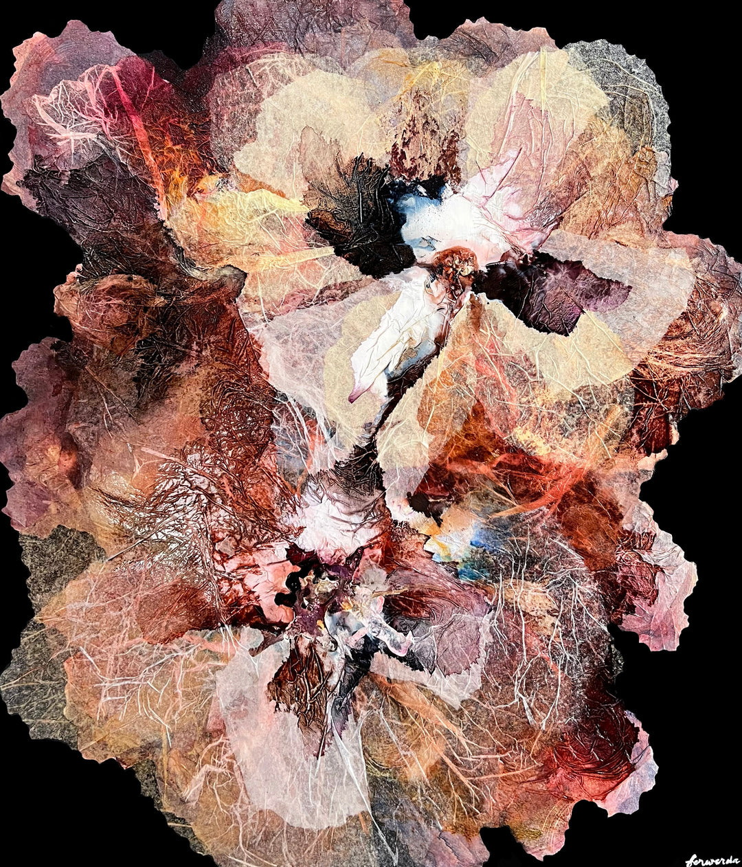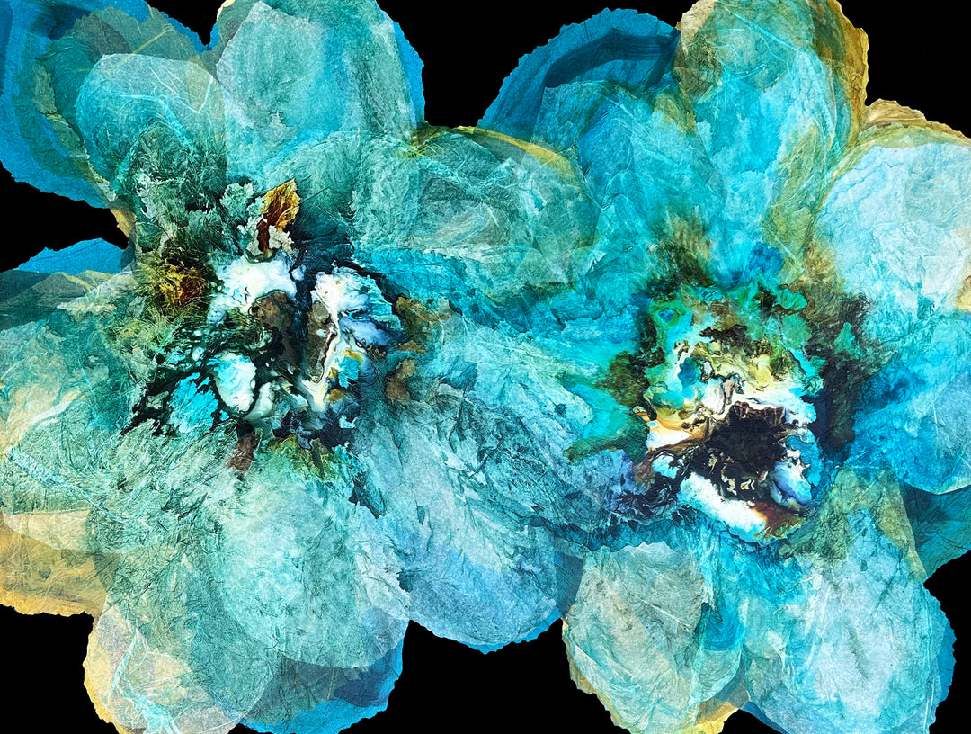 Presenting poppies in an expansive manner, flowers are dissected and displayed as transparent images loaded with frenetic activity. Black backgrounds are in stark contrast to the soft, painterly nature of petals, viewed in an expanded context like looking into the universe.