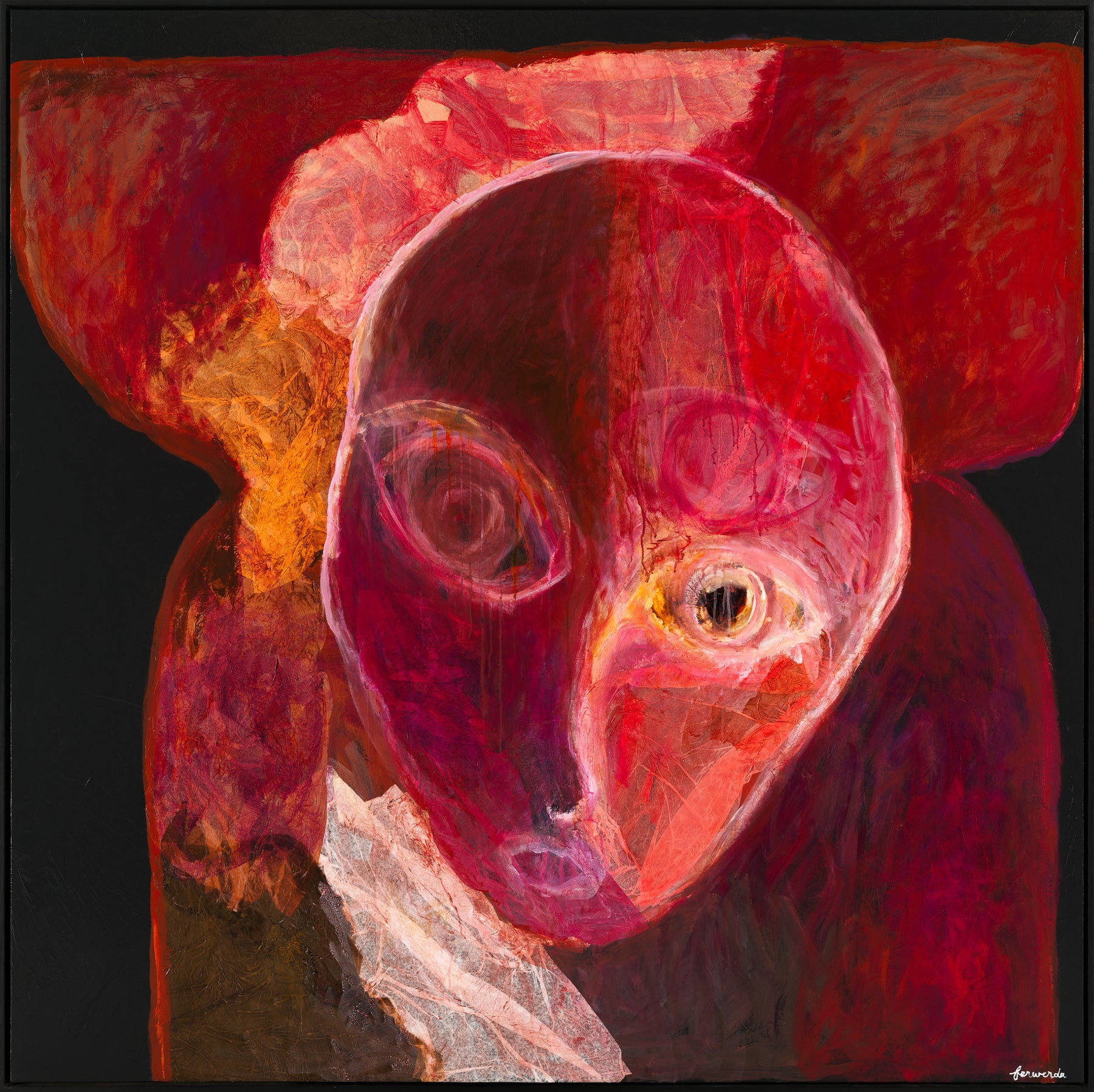 A deeper imagining of the artist, this work is a tribute to modern life and a return to the inner making of art. Masked explores a reimagining of the human face as the shadow of the child within the artist. Sketching in paint, oil pastel and layering hand-torn paper with rich, bold inks to capture the gaze of the viewer, the human body is represented as a sculpture. Masked makes a dramatic design statement and metaphorically references the human form as a vessel housing the creative freedom of the artist’s subconscious.