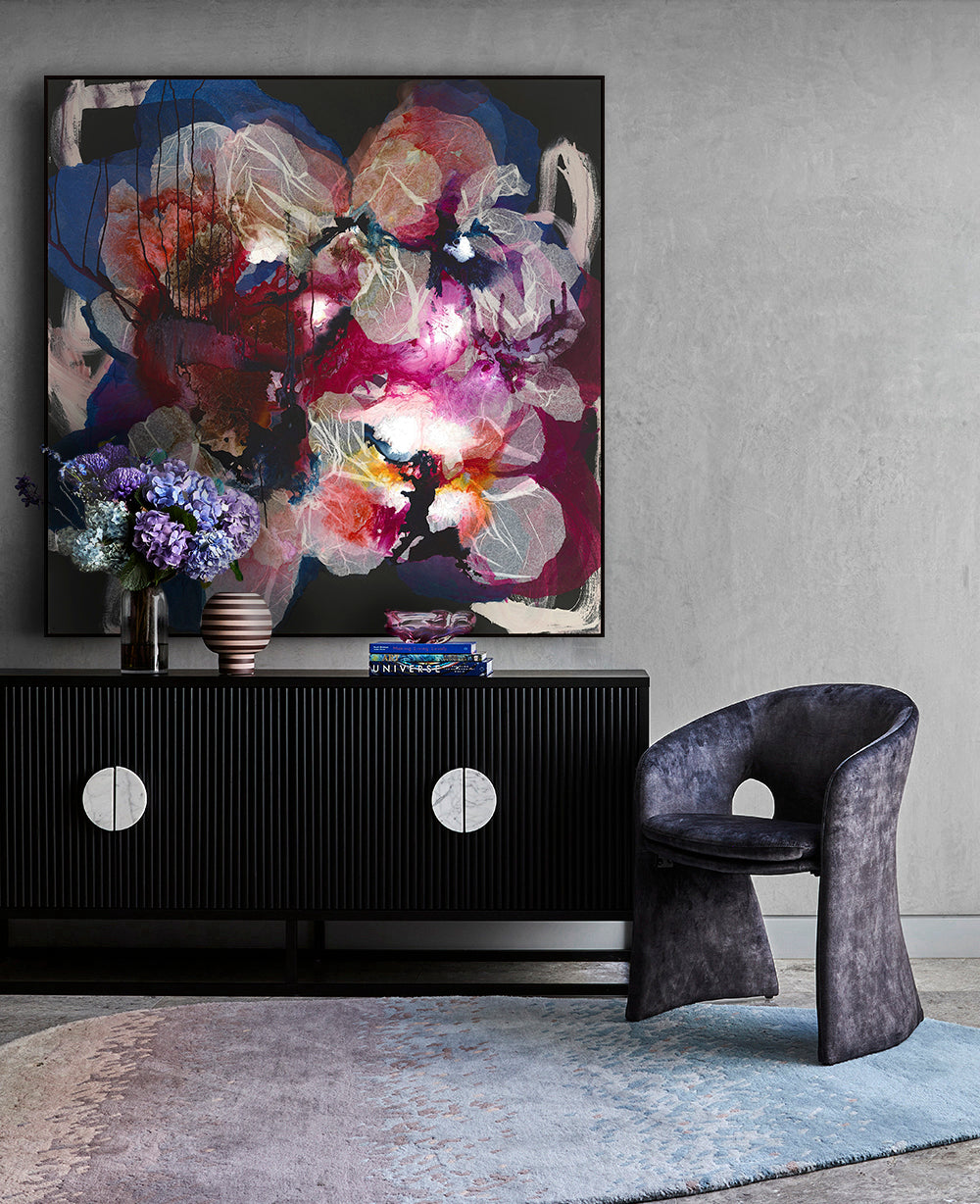 Perfectly Imperfect is a visual symphony of electrifying colour and emotion. Through numerous layers of translucent pigment, Antoinette Ferwerda evokes the essence of blooming forms, not as fixed subjects but as shifting sensations. The composition pulses with energy, where vibrant crimsons and fuchsias collide with inky blues and whispering whites, while delicate veining and gestural drips bring movement and depth. Honouring the unpredictable nature of life, Ferwerda invites us to find beauty in the unrefined moments that are tender, raw, and wholly human. This is abstraction at its most intimate: bold, floral, and quietly triumphant.