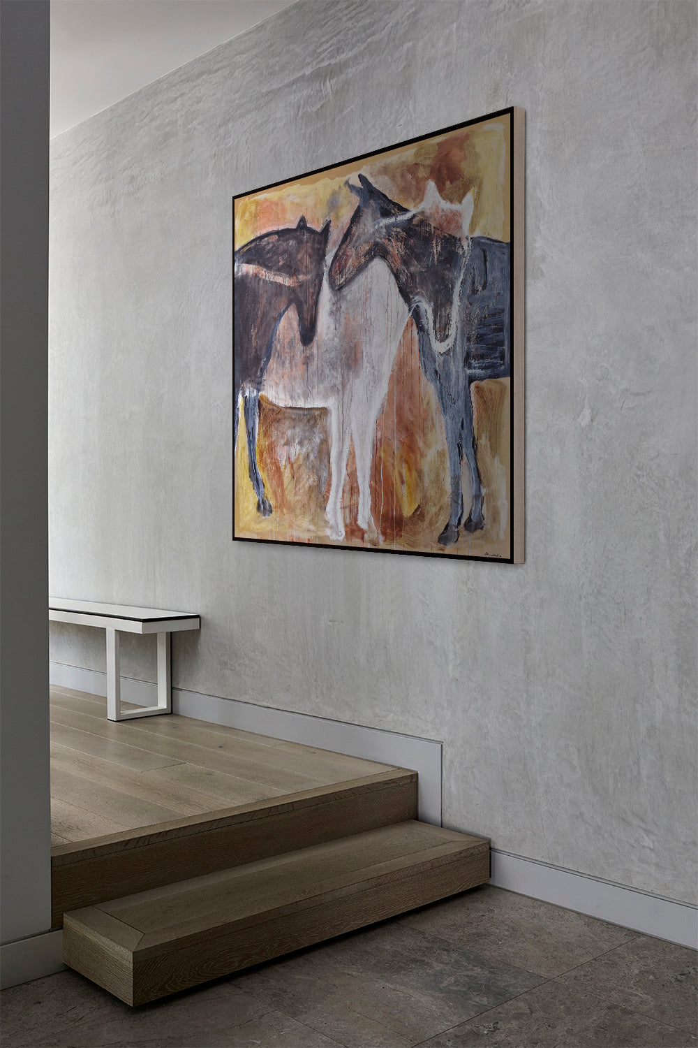 All the King's Horses offers a commanding yet intimate portrayal of horses not merely as subjects, but as emotional mirrors to humankind. Drawn to their strength, grace, and innate intelligence, Ferwerda renders these noble figures in layered tones of umber, charcoal, and chalky whites, blending earthy warmth with gestural energy. Through expressive brushwork, subtle transparencies and the quiet rhythm of drips, the composition breathes with sensitivity and grounded power elevating the horse as both mythic symbol and familiar companion. All the King's Horses resonates beyond its visual elegance, it is a narrative work of substance, honouring the long-standing bond between horse and human, and speaking to our shared need for connection, order, and belonging.