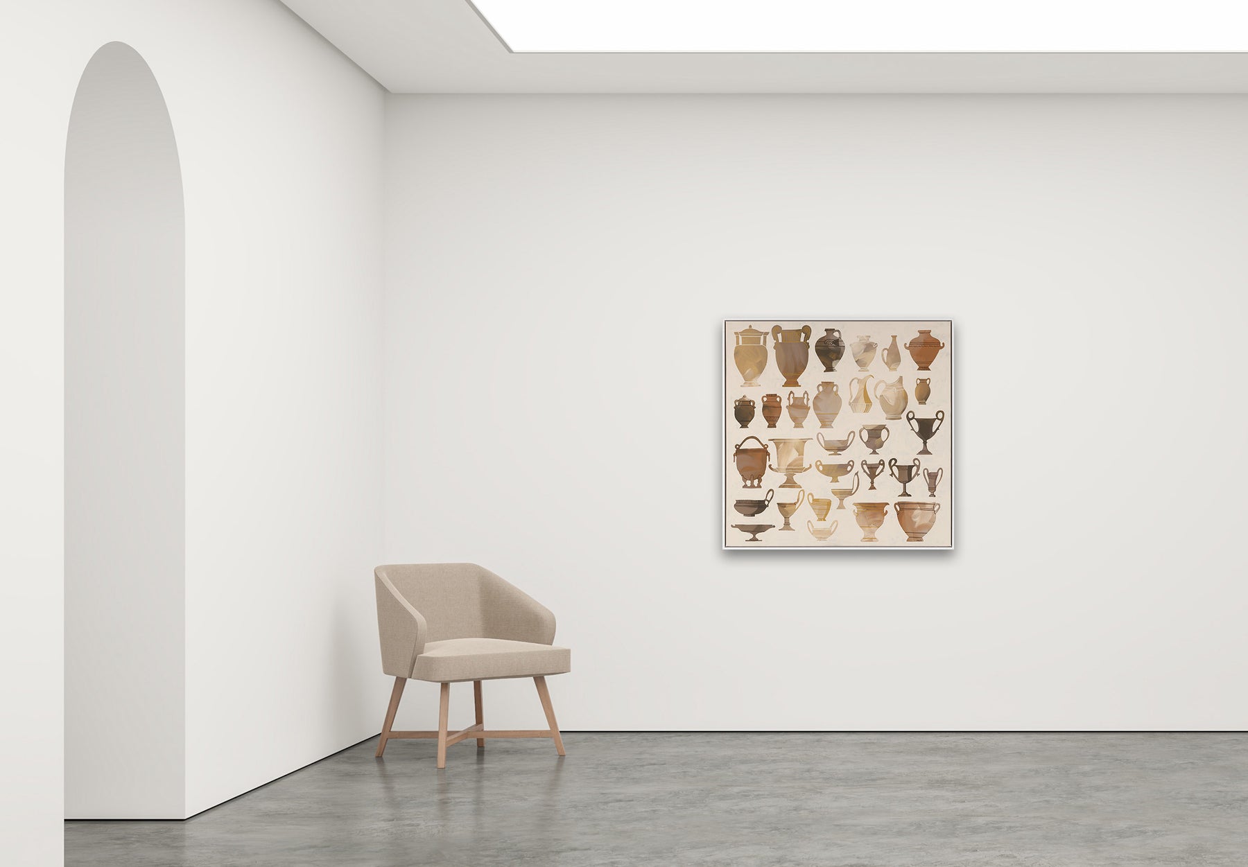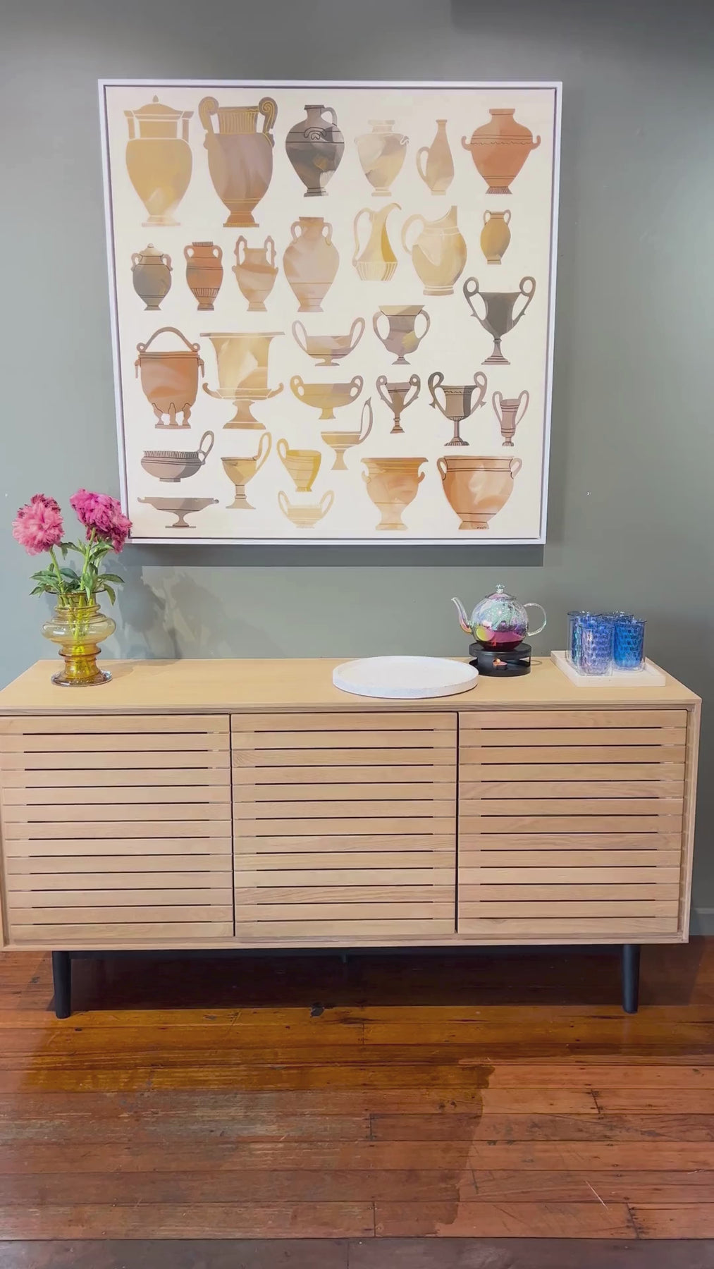 Amphoras of the Sun by fine artist Lara Moisi pays elegant tribute to the vessels of her Greek heritage. Referencing classical Greek amphoras, the work arranges silhouettes in harmonious repetition, each form softly rendered in sun-bleached terracottas, ochres, and marbled neutrals. These ancient shapes become meditative icons, quietly echoing rituals, craftsmanship, and myth. Moisi’s palette glows with warmth, while the absence of detail invites viewers to imagine their own stories held within each vessel. A contemporary ode to legacy, memory, and the enduring poetry of form.