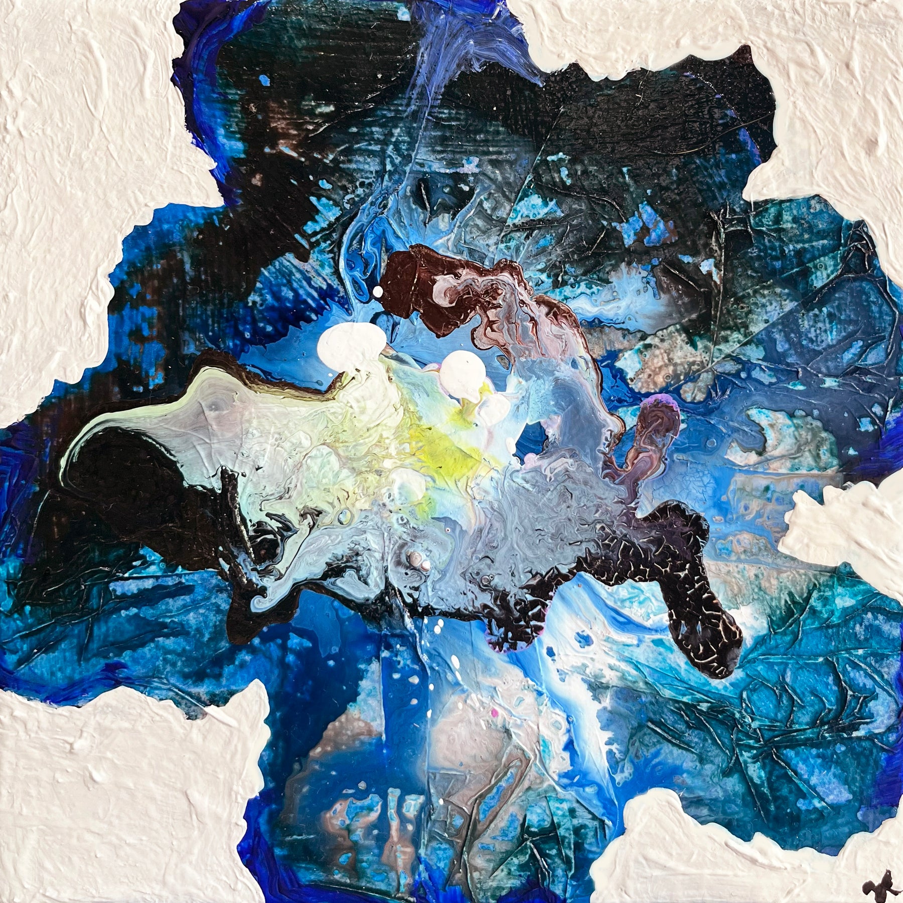 Synthetic polymer paint, ink and collage with UV gloss varnish on canvas