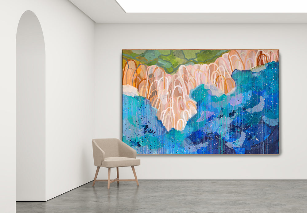 Soft, sandy ochre tones evoke the warmth of sunlit cliffs, their textures hinting at ancient geological stories, while vibrant blues of the sea and sky create a striking counterpoint. The interplay between these hues captures the vivid energy and atmosphere of this iconic bayside landmark. Half Moon Bay Hills is a contemporary yet timeless portrayal that invites the viewer to feel the salt air, hear the ocean’s murmur, and step into the scene themselves.
