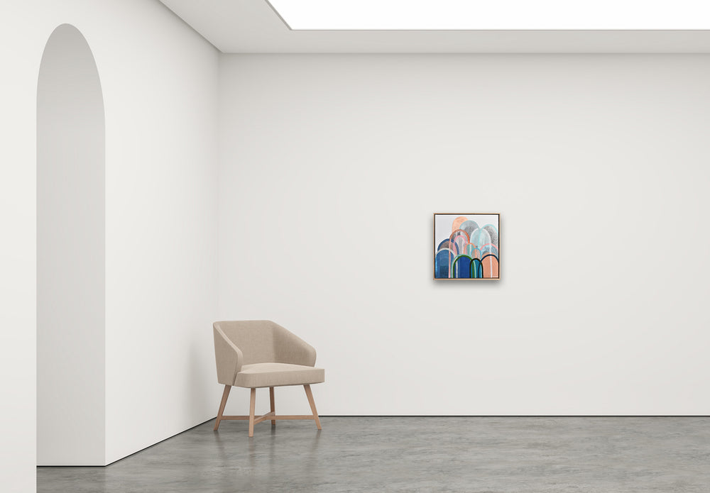 Gordons Bay Hills embodies Antoinette Ferwerda’s iconic Hills story, where stylised landscapes emerge through repeated arch forms. Layered deep blues, greens, peach, and metallic copper rise and overlap, creating a rhythmic composition that feels both architectural and organic. The arches shift in meaning, suggesting hills, rainbows, or built structures, opening interpretation to each viewer’s perspective.