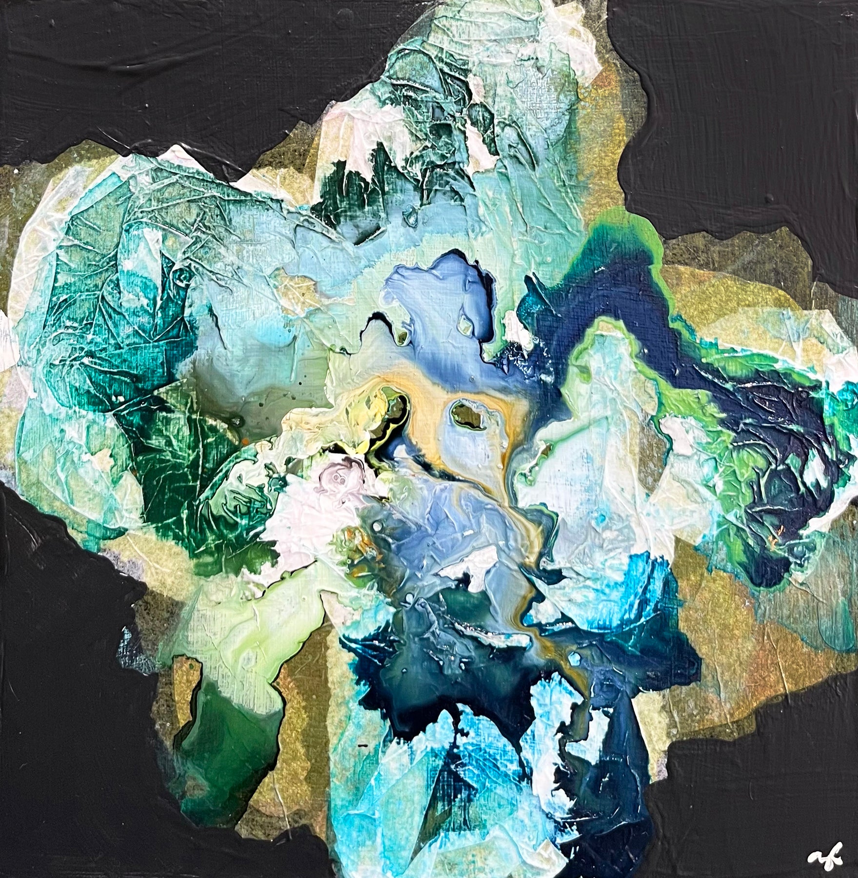 Synthetic polymer paint, ink and collage with UV gloss varnish on board