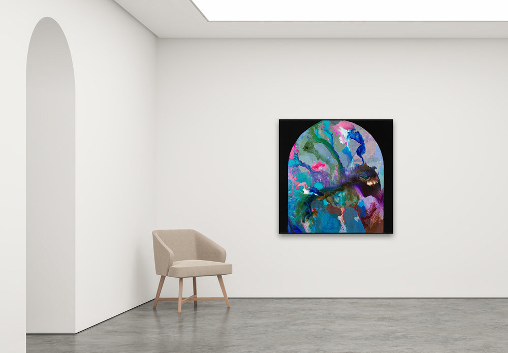 My Secret Sea Cave draws viewers into an immersive underwater world, framed within an arched composition that feels like peering through an opening into hidden depths. Flowing ink of turquoise, emerald, and cobalt merge with bursts of magenta, violet, and amber, their fluid forms rippling like tidal currents or glowing coral. Layered textures echo the surfaces of stone, sand, and submerged rock, while highlights suggest shifting light beneath the sea.