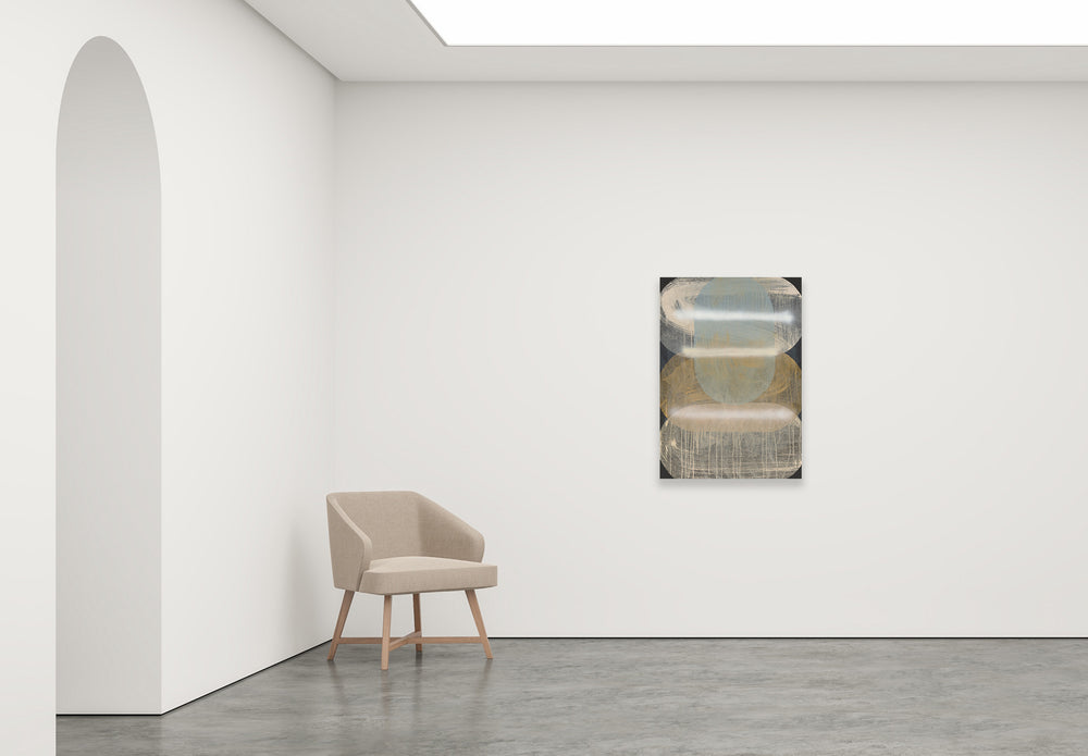 An exploration of transparency and form, Neon Study I reimagines architectural structure through Antoinette Ferwerda’s signature collage technique. In this work, softly rounded, capsule-like shapes overlap in veils of ochre, and pale blue, their surfaces brushed with luminous white bands that glow like diffused neon light.