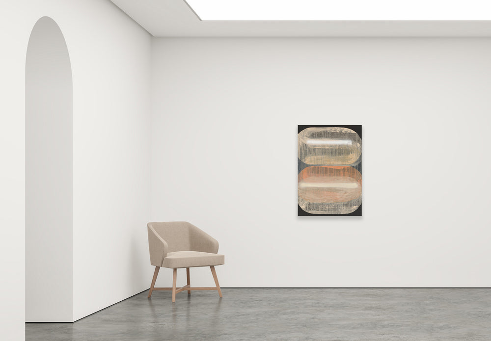 Neon Study II presents two luminous, capsule-like forms stacked with deliberate tension, their softened architectural curves glowing against a dark ground. The upper register shimmers in muted ochre and slate, while the lower form radiates oxide orange and chalk white, their layered translucence creating the effect of illuminated glass or polished stone. Vertical streaks cascade across the forms, evoking time, weather, and the trace of the hand.