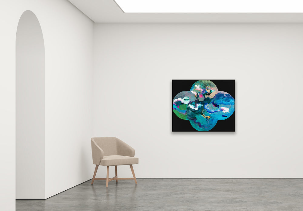 Sea Clouds depicts four overlapping circular forms set against a black ground, resembling a magnified window into the ocean’s hidden world. Swirling pools of turquoise, teal, and deep blue blend seamlessly with bursts of magenta, fuchsia, and white, like coral blooms or drifting seafoam. Streaks of soft neutrals break through the composition, adding warmth and contrast to the cool palette.