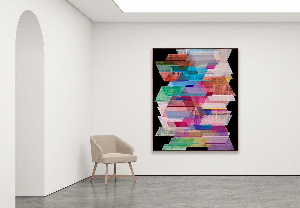 This large-scale piece draws the viewer in through its structured geometric forms, layered with delicate, translucent materials that create a crystalline, light-filled effect. Clean-edged shapes are arranged with purpose and rhythm, forming a visual architecture that feels both grounded and expansive. The careful balance of soft neutrals, glowing whites, and glints of gold suggest a solar or celestial presence, echoing the work’s title. Solar Crystalline evokes a sense of stillness and strength, inviting reflection on themes of illumination, transformation, cosmic connection, and the unseen energy that surrounds us. Framed in natural oak, this work creates a contrast to its celestial references and ensures it integrates beautifully into architectural spaces. It encapsulates Ferwerda’s refined approach to abstraction, where precision, emotion, and intuition meet in a quiet but powerful visual language.