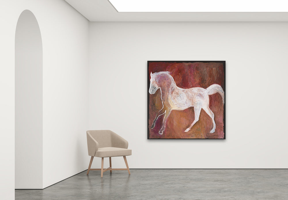 In Succession March, a white horse stands boldly against a richly textured background of burnt umbers, deep reds, and earthy browns. Its body is rendered with layered strokes of white and pale tones, allowing hints of pinks, ochres, and greys to shine through, giving the animal a luminous, almost ethereal quality.