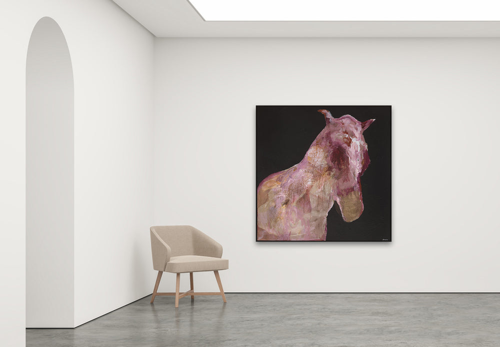 The animal’s head tilts downward in a moment of quiet poise, its ears pricked and mane abstracted into washes of colour. Against the stark black background, the horse appears luminous and monumental, its textured body radiating both strength and vulnerability. The interplay of rich pinks and earthy hues imbues the figure with a totemic quality, embodying beauty, power, and spiritual presence.