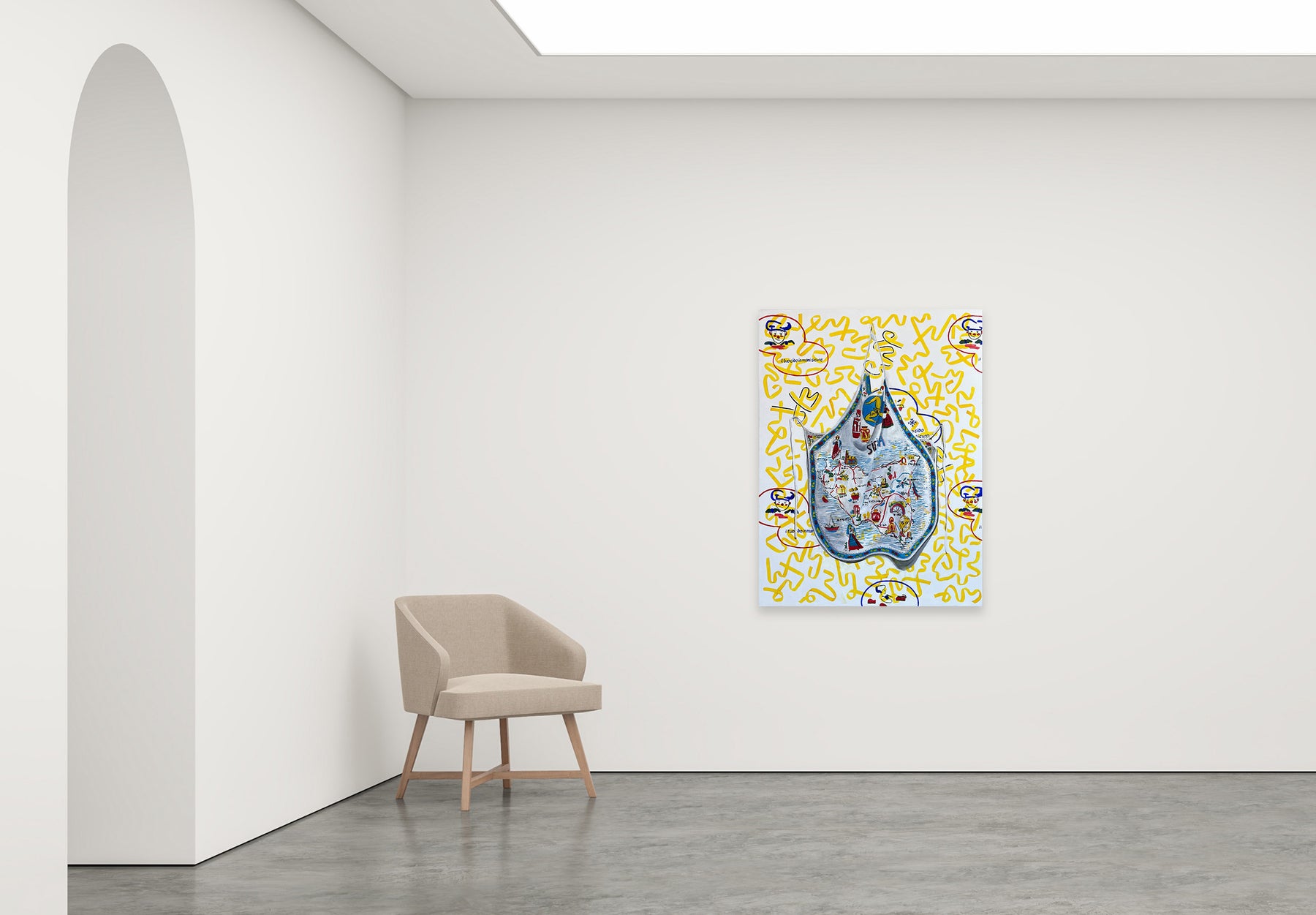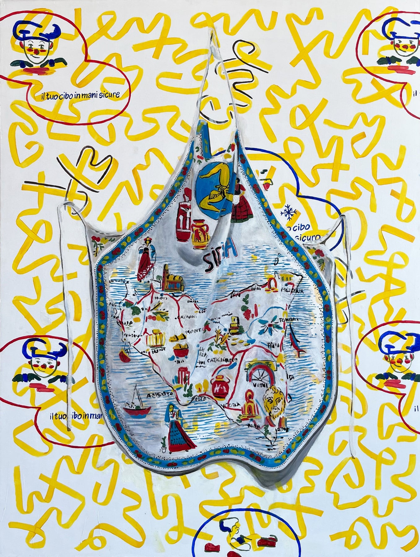 Il Tuo Cibo in Mani Sicure (Your Food is in Safe Hands), playfully blends nostalgia and irony, transforming a Sicilian apron into a cultural canvas. Through vivid oil and acrylic detail, Erica D’Ali maps a personal terrain of heritage and identity, layered with warmth, memory and commercial kitsch. The artwork’s hand-drawn motifs and branded slogans invite viewers to reflect on the intersection of tradition and consumerism, comfort and distance. Bold yet familiar, this piece offers a vibrant and thought-provoking addition to any collection, perfect for those beginning their art journey with meaning and colour.