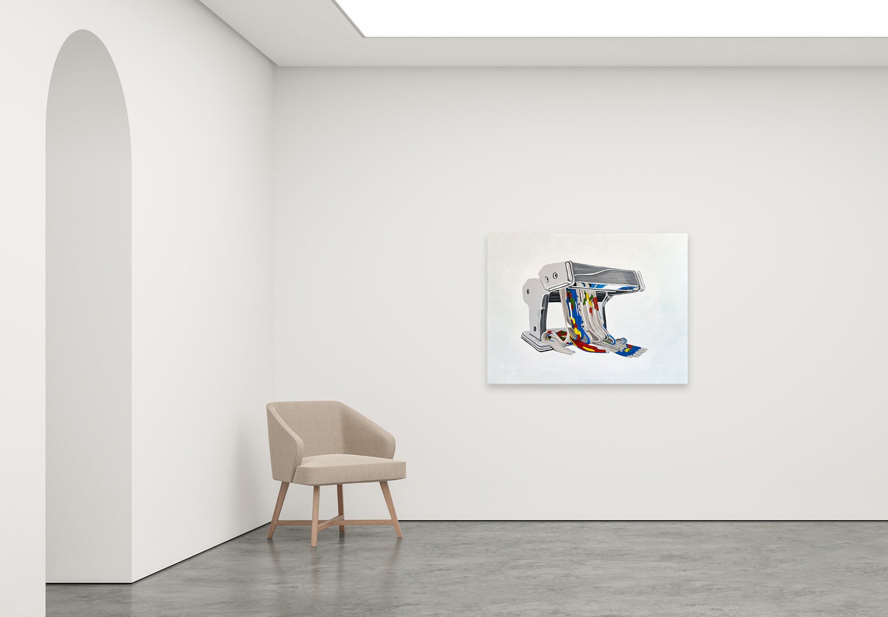 Pasta Machine distills memory into a minimalist moment, where the chrome gleam of a familiar kitchen tool meets the vivid fabric of cultural identity. With striking clarity and playful contrast, the reimagining of this domestic icon is transformed into a symbol of heritage both cherished and evolving. Saturated with Mediterranean colour and soft humour, this piece is a bold yet intimate celebration of everyday rituals. Pasta Machine offers a unique entry point into art collecting; joyful, accessible, and rich with personal resonance.